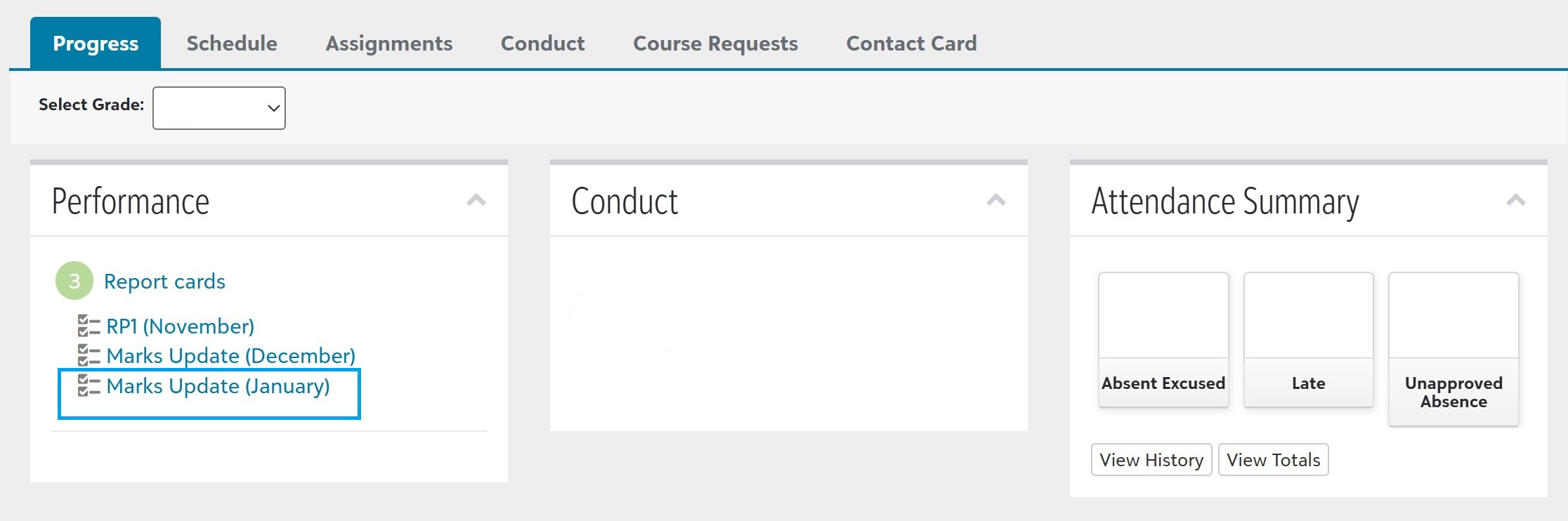 • Directly below your child’s photo and name you will see a menu of items starting with ‘Progress’. Stay on this page and under the ‘Performance’ section click on ‘Report Cards’. To see a sample view please click here.