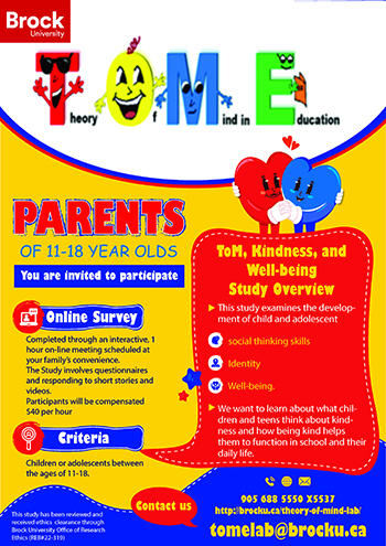 A Brock University research team, the Theory of Mind in Education Lab, is looking for youths (ages 11-18) to participate in a study on the development of child and adolescent social thinking skills, identity, and wellbeing. The online sessions will be completed through an interactive, online meeting scheduled at your family's convenience and the study involves questionnaires and responding to short stories and videos. Compensation is provided. Visit the ToME Lab webpage or e-mail tomelab@brocku.ca to learn more.